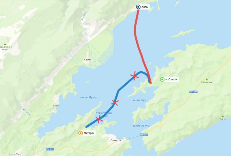 Переправу сделали за два дня. На ней установлены вешки, разграничивающие полосы для движения, дорожные знаки. Строительство переправы было согласовано с ФГБУ «Заповедное Прибайкалье». Новая дорога идёт от местности Халы до залива Иркутская Губа, имеет две полосы для движения, между ними расстояние 100 метров. Длина переправы – 10,6 километра, грузоподъёмность – 10 тонн. Движение по переправе разрешено только в дневное время, в ночное время выезд будет перекрыт.