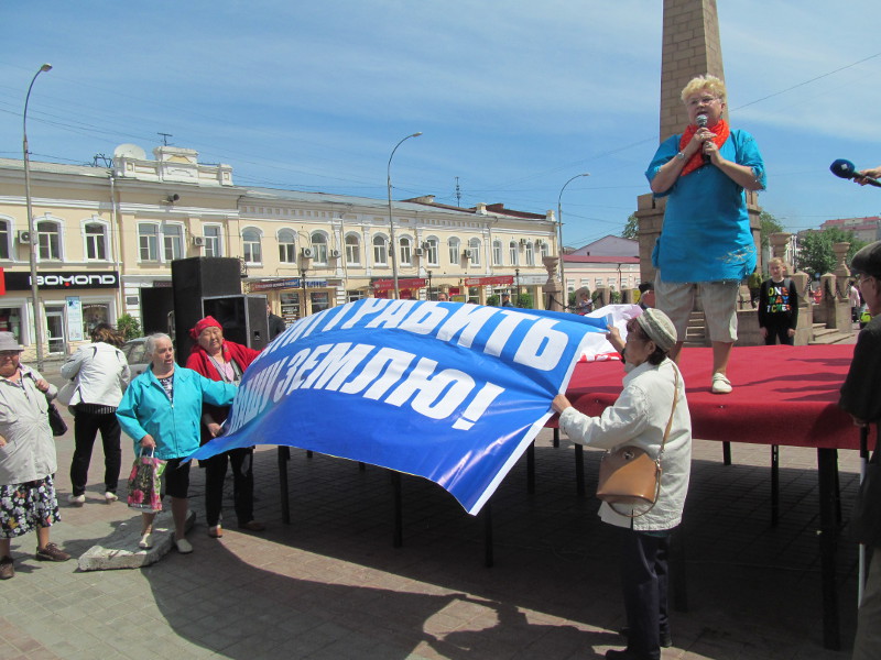 С прорвавшимся на митинг банером «Хватит грабить нашу землю!» вышла поистине героическая история. Даже его, прошедший несколько фильтров из сотрудников различного ранга и разрешенный к использованию, сотрудники вдруг начали вырывать из рук митингующих, устроив таким образом самоуправство. Полицейские упорно тянули плакат к себе, митингующие к себе. И здесь в бой пошли старики. Бабушки и дедушки с криками: «Не отдадим плакат! Не отдадим нашу землю! Что за 37-ой год!» бросились к баннеру и отважно начали его отвоевывать его у правоохранителей. Полицейские не церемонились – грубо отталкивали стариков, подминая их под себя.