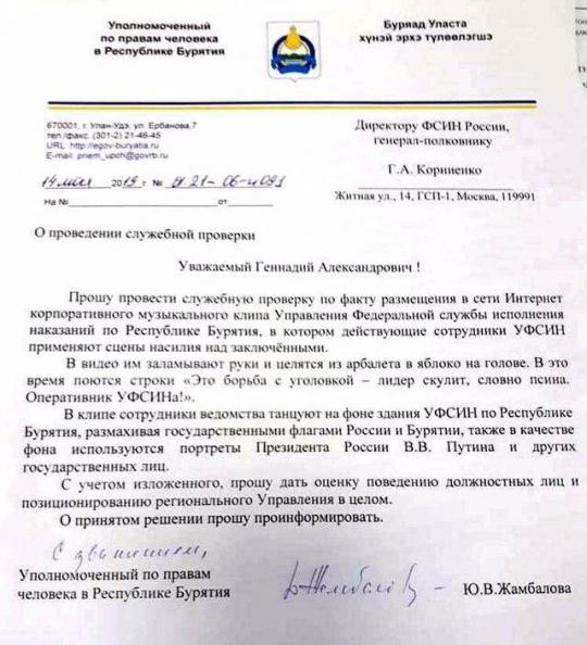 Вот только прибегла она к более жестким методам. Уполномоченный написал письмо руководителю ФСИН России Геннадию Корниенко с просьбой провести проверку по факту размещения в интернете музыкального клипа и дать оценку поведению должностных лиц, участвовавших в съемке. Любопытно, но омбудсмена больше возмутило то, что своими выходками ФСИН якобы подмочила репутацию Владимира Путина.