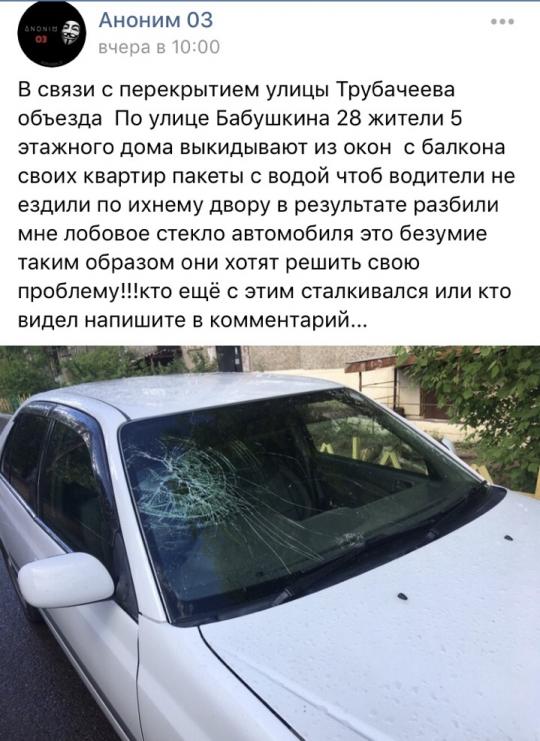 Сообщения о противостоянии жителей домов и водителей появились в соцсетях. Недовольные водители пишут, что их машины закидали пакетами с водой. В одном случае в результате «бомбардировки» у авто пострадало лобовое стекло.