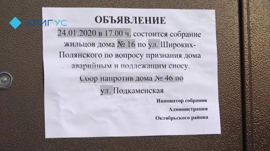 "Наш дом собираются перевести в статус аварийного с последующим сносом. С чем мы, жильцы, категорически не согласны. Наш дом благоустроенный. Там четыре квартиры. Внизу офисное здание. Мы живем в центре города. Квартиры нас устраивают. Да, наш дом не новенький. Но куда больше у нас по городу, по району, по республике домов, которые нуждаются в том, чтобы их признали аварийными," - прокомментировала Татьяна Манзанова, житель дома №16 по улице Широких-Полянского.