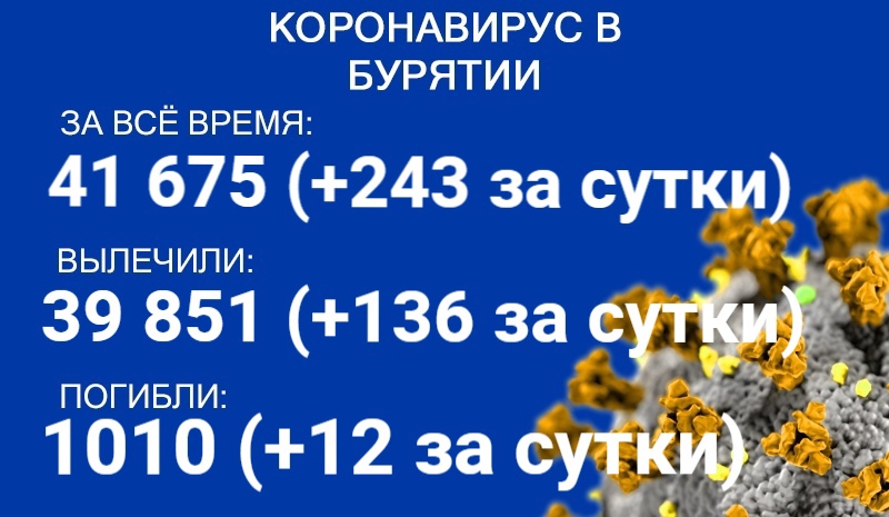 По данным на 20 июня, еще 243 человека в Бурятии заболели COVID-19. Также за сутки 136 пациентов выздоровели, 12 скончались. Об этом сообщает пресс-служба регионального Роспотребнадзора.