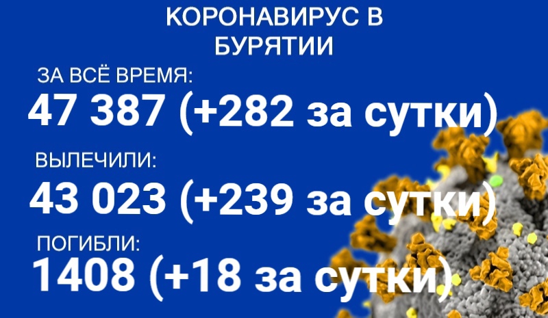 По данным на 9 июля, еще 282 человека в Бурятии заболели COVID-19. Также за сутки 239 пациентов выздоровели, 18 скончались. Об этом сообщает пресс-служба регионального Роспотребнадзора.
