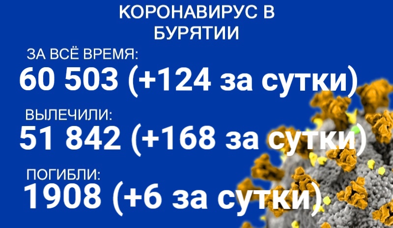 По данным на 14 октября, еще 124 человека в Бурятии заболели COVID-19. Также за сутки 168 пациентов выздоровели, еще шесть скончались. Об этом сообщает пресс-служба регионального Роспотребнадзора.