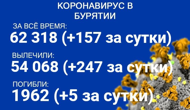 По данным на 26 октября, еще 157 человек в Бурятии заболели COVID-19. Также за сутки 247 пациентов выздоровели, пятеро скончались. Об этом сообщает пресс-служба регионального Роспотребнадзора.