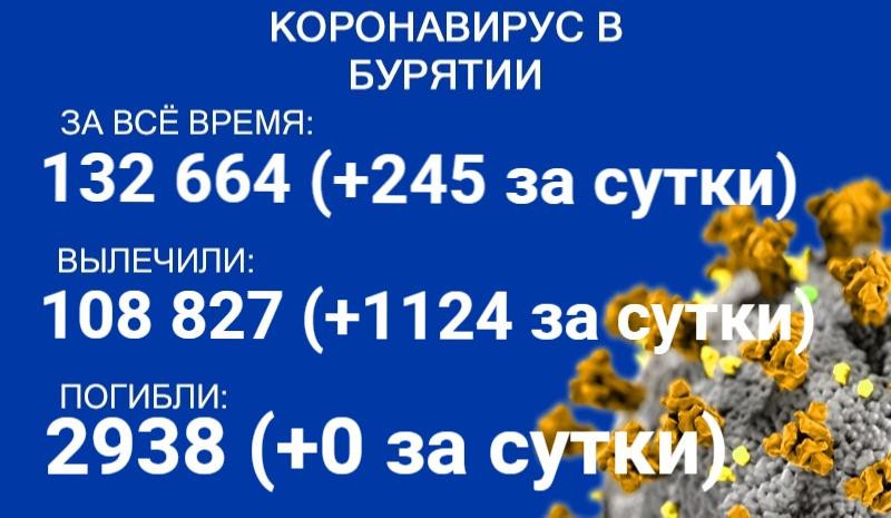 По данным на 19 марта, еще 245 человек в Бурятии заболели COVID-19. Также за сутки 1124 пациента выздоровели. Новых летальных исходов зарегистрировано не было. Об этом сообщает пресс-служба регионального Роспотребнадзора.