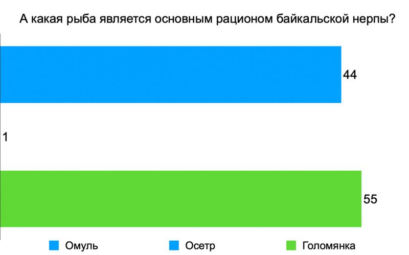 Чуть больше половины (55%) участников опроса угадали основной рацион эндемика. Но 44% отдали свой голос омулю, которым нерпа практически не питается, так как попросту не может догнать быстро плавающую рыбу.