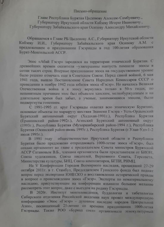Общественники и деятели культуры Бурятии написали письмо-обращение руководителям трех регионов — главе Бурятии Алексею Цыденову, губернатору Иркутской области Игорю Кобзеву и губернатору Забайкальского края Александру Осипову с предложением устроить праздник Гэсэриады в год столетия образования БурАССР. Властям предлагается создать идеологию Гэсэриады как международного праздника дружбы и единства.