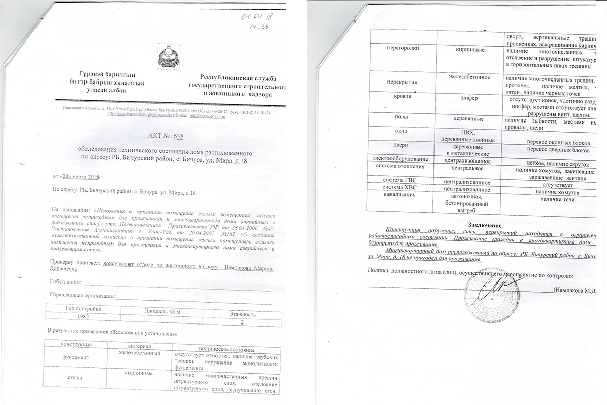 Ужасающие новости поступили в редакцию Бабра из села Бичура. Детей-сирот с 2018 года заселяют в злосчастный дом № 18 по улице Мира. Согласно заключениям экспертов, это двухэтажное здание 1983 года постройки не подлежит сносу. В то время как его фундамент имеет глубокие трещины, стены деформированы. Вентиляционные шахты разрушены, а шифер на крыше местами отсутствует, из-за чего в дом просачивается вода.