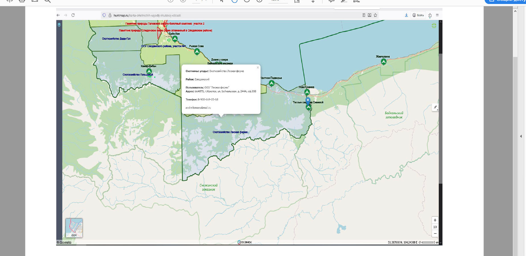 Однако покупка «Байкал Сити» — не единственная операция, проведённая через московскую фирму-прокладку. Согласно выписке из ЕГРЮЛ, 24 сентября 2025 года то же самое ООО «КБФ» Екатерины Зуевой стало единственным учредителем иркутского ООО «Лесная ферма» (ОГРН 1163850062090). Эта компания, судя по карте охотничьих угодий, владеет участками, непосредственно примыкающими к Выдрино.