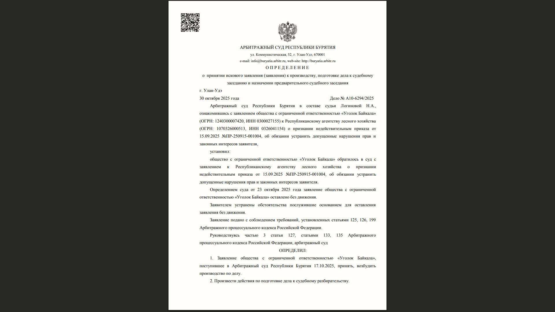 Компания ООО «Уголок Байкала» 22 октября подала иск в Арбитражный суд Бурятии к Республиканскому агентству лесного хозяйства (РАЛХ). Предприниматели требуют признать незаконным приказ ведомства, который заблокировал их проект по созданию рекреационной зоны в Прибайкальском районе.