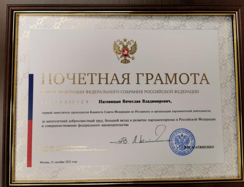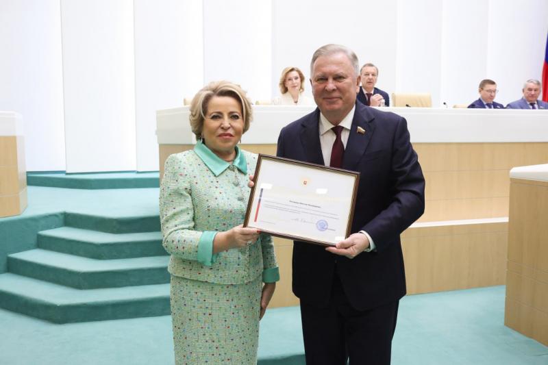 Вячеслав Наговицын и Валентина Матвиенко с почётной грамотой