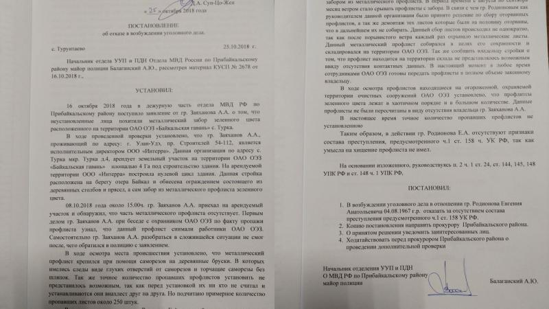 История, изложенная в постановлении, достойна отдельного рассказа. 16 октября 2018 года в полицию поступило заявление от исполнительного директора ООО «Интерра» Зарханова. Компания арендовала земельный участок на территории особой экономической зоны (ОЭЗ) «Байкальская гавань» и строила там некое здание. Стройка была обнесена забором из металлического профлиста зелёного цвета. 8 октября Зарханов обнаружил, что часть забора исчезла. В ходе беседы с охранником он выяснил, что профлист снимали работники ОАО «Байкальская гавань», управляющей компании всей зоны.