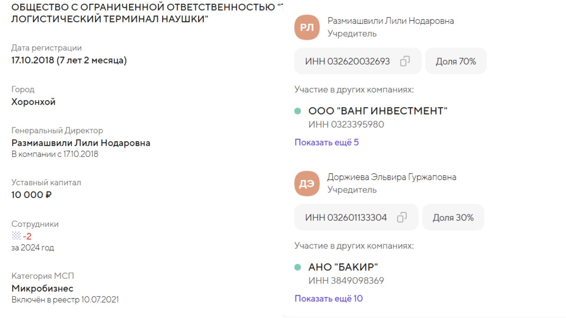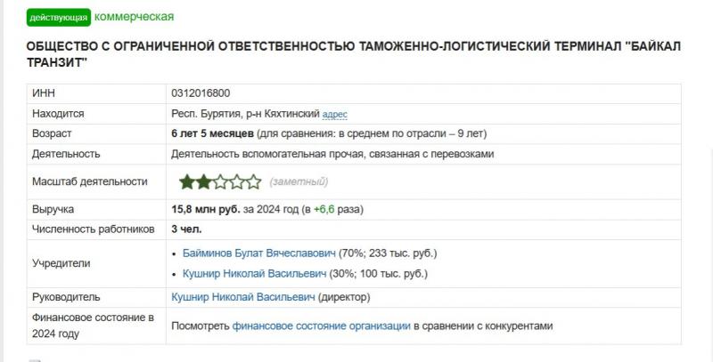 Проверка через базы данных показывает, что компания «Байкал Транзит» существует с 2019 года, но к 2025 году нажила всего трёх штатных сотрудников. Это микропредприятие с минимальными оборотами (в 2024 году чистая прибыль равна 24 тысячам рублей), миллиардная стройка ей не по зубам. «Инвестор» даже пару офисных кресел не купит с собственных денег. И крутого федерального гиганта за их плечами не стоит.
