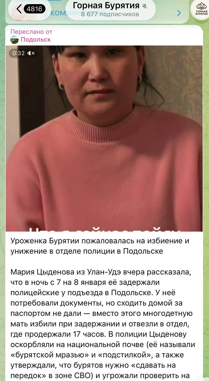 Из телеграм-канала «Подольск» только что исчезла публикация о происшествии в местном отделении полиции, где с серьёзными нарушениями ночью 7-8 января задержали уроженку Бурятии Марию Цыденову.