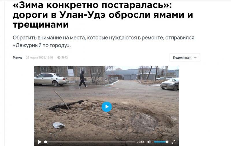 В марте улан-удэнцы массово застревали в пробках у Центрального рынка и на улице Гагарина. 29 марта в Сотых кварталах на улице Ринчино водитель иномарки Nissan Tiida рухнул в глубокую яму из-за внезапного провала дорожного полотна. Кроме того, подчинённые мэра целый месяц игнорировали гигантскую выбоину на улице Кирпичной и просто сыпали в неё песок.