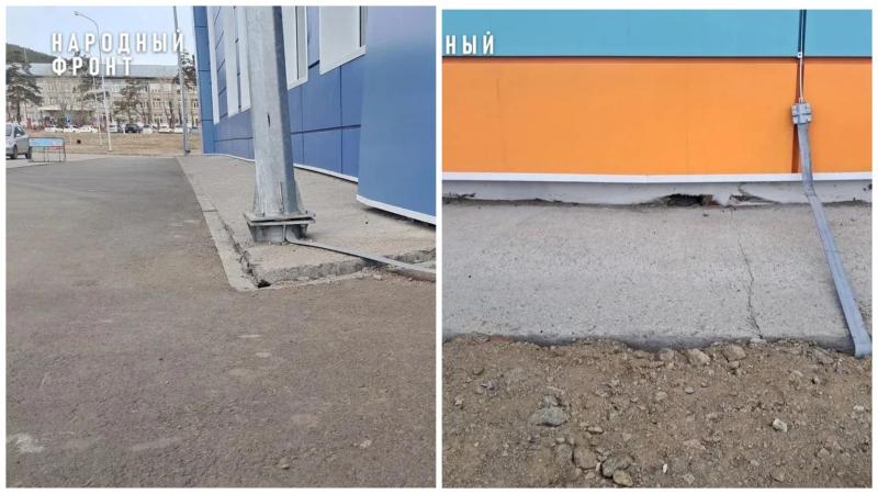 Может, Бадарханов поддался соблазну лёгкого заработка, но в целом с задачей справился? Мэрия сдала готовый объект в эксплуатацию в апреле 2025 года. Спустя год асфальт покрылся трещинами, а фасадная краска отслоилась. Бетонная отмостка просела ниже уровня фундамента, утянув за собой фонарные столбы.