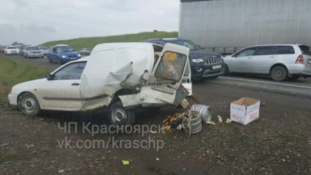 В Красноярске 12 июля, поздно вечером, на выезде из города столкнулось три машины. По предварительной версии, водитель автомобиля Volkswagen резко затормозил, в него влетела Toyota Filder, в нее врезался грузовик MAN. В результате аварии владелец Volkswagen получил травмы.