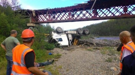 В республике Бурятия 14 июля в 14:30 по дороге между станциями Тыя и Гоуджекит ехал загруженный строительными материалами грузовик. Мост не выдержал, машина полетела вниз, перевернулась в воздухе и упала на крышу. Шофер отделался переломом руки.