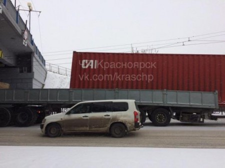 В Красноярске на проспекте Свободный большегруз в очередной раз врезался в путепровод. Инцидент произошел 10 ноября в первой половине дня. Фура, по габаритам превышающая высоту путепровода, пыталась проехать под сооружением, однако не смогла и задела один из пролетов.
