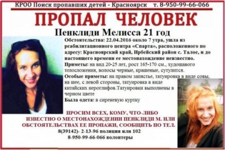 Отчим девушки, пропавшей 22 апреля 2016 года, обратился к главному следователю СК РФ Бастрыкину. Мелисса Пенклиди проходила реабилитацию в центре «Спарта», в селе Талое Ирбейского района. За несколько дней до окончания курса девушка исчезла.
