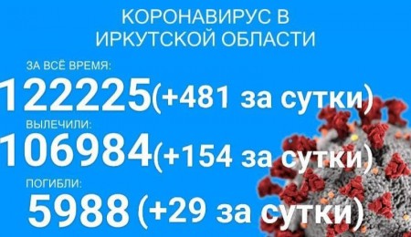 По данным оперштаба Иркутской области на 31 октября, в регионе официально зарегистрировано 122225 заразившихся коронавирусом, 106984 выздоровевших, 4923 госпитализированных и 5988 умерших от этого заболевания. Прирост за сутки составил: 481 новый случай заражения, 154 выздоровевших и 29 умерших.