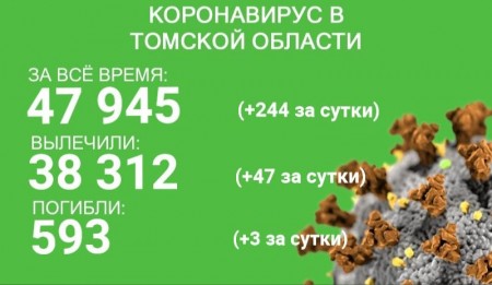 По состоянию на 31 октября в Томской области зарегистрировано 47 945 случаев коронавируса. В минувшие сутки заболевание зарегистрировано у 244 жителей региона. С начала эпидемии излечились 38 312 жителей региона. В минувшие сутки выздоровели 47 пациентов.