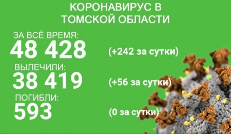 В Томской области за сутки с 1 по 2 ноября коронавирус зарегистрировали у 242 человек. Всего выявлено 48 428 случаев заболевания. С начала эпидемии излечились 38 419 человек. В минувшие сутки выздоровели 56 пациентов. От коронавируса и его осложнений в регионе скончались 593 человека.