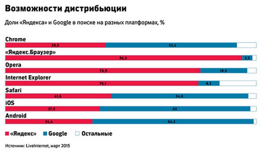 В результате долю конкурентов на разных платформах определяют каналы дистрибьюции. Например, в «Яндекс.Браузере» доля поисковика «Яндекс» составляет 95%, говорит создатель счетчика LiveInternet Герман Клименко, а в Google Chrome — меньше 40%. Он не верит, что 95% — это доля лояльных пользователей, в среднем по рынку она в 1,5 раза меньше. В телефонах на Android «Яндекс» уступает Google, а в Nokia X с предустановленным поиском — обгоняет в два с лишним раза. В магазине приложений «Яндекс.Стор» вообще нет сервисов Google, хотя в Google Play сервисы «Яндекса» есть. Зато сам «Яндекс.Стор» нельзя устанавливать в телефоны на платформе Android — на этом настаивает Google, рассказал журналу «РБК» руководитель одного из локальных производителей телефонов для российского рынка.