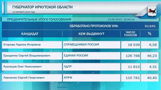 По состоянию на 19:08 московского времени после обработки 50,9% протоколов с избирательных участков кандидат от "Единой России" Сергей Ерощенко набирает 46,2% голосов (126,6 тысяч избирателей).
