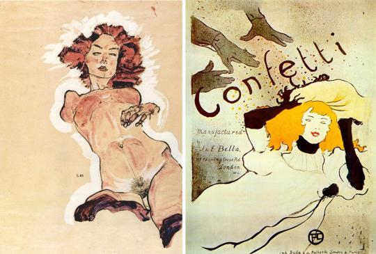 Слева: Обнаженная, Шиле. Справа: Конфети, Тулуз-Лотрек