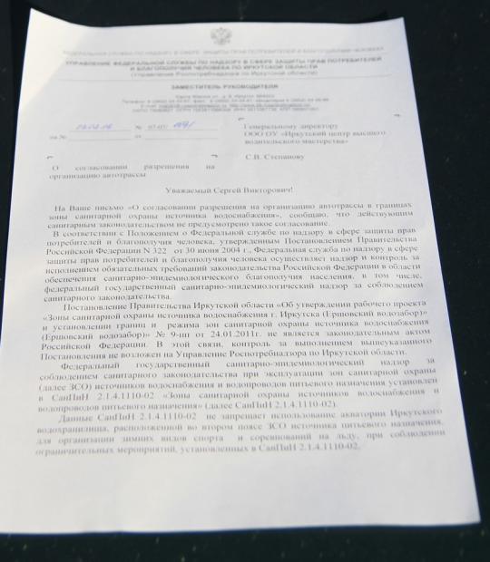 Мы отправили запрос в Западно-Сибирскую прокуратуру разъяснить нам, с какими ведомствами нам необходимо согласовывать автодром. Прокуратура ответила, что договор водопользования нам не нужен, так как у нас учебная езда (Водный кодекс РФ, статья 11). Нам нужно было согласовать только с Роспотребнадзором, ведь мы находимся во втором санитарном поясе Иркутского водозабора, и они нам ответили, что нам можно организовывать трассу.