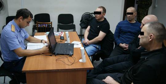На фото: Следователь по особо важным делам СУ Максим Биктимиров знакомит участников преступного сообщества с материалами уголовного дела