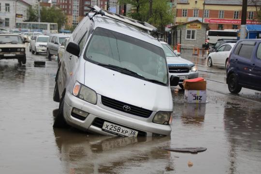 Toyota Noah провалился в яму возле автовокзала в центре Иркутска. Автомобилист ехал по улице Октябрьской Революции в сторону Карла Маркса. Дорога в результате ливня превратилась в сплошную лужу.