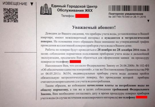 В «извещениях» говорится об обязательной метрологической поверке счетчиков в установленные неким графиком сроки, указан телефон для оформления некой заявки, а также содержится предупреждение о том, что индивидуальные приборы учета воды должны пройти обязательную метрологическую поверку.