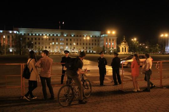 Полицейские и жители Иркутска застыли в ожидании приезда президента России Владимира Путина вечером 15 мая.