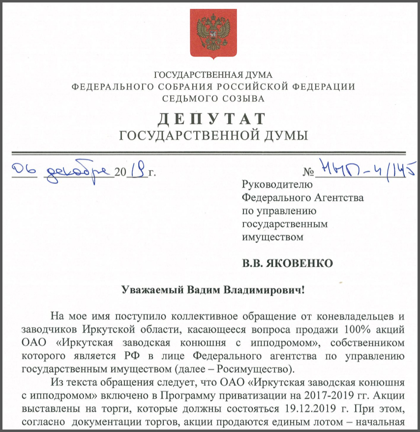 6 декабря депутат Госдумы от Иркутской области, председатель комитета по природным ресурсам Николай Николаев направил запрос в Росимущество и в Министерство экономического развития России по проблеме Иркутского ипподрома.