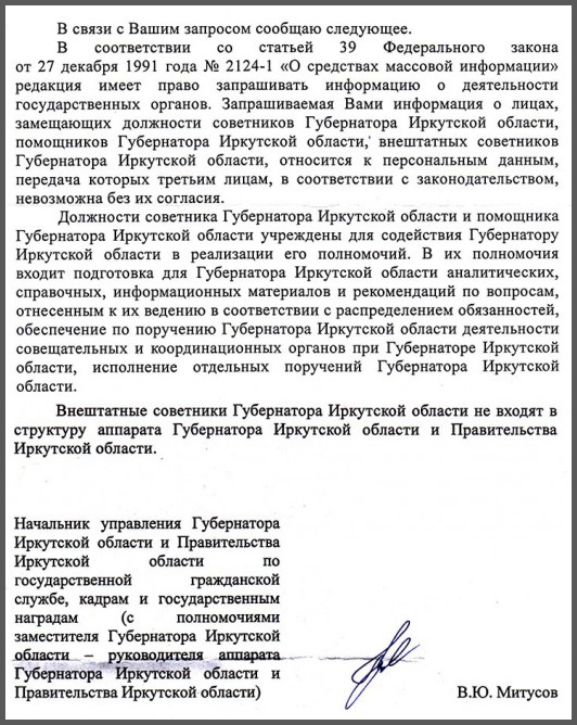 Неопытность нового врио руководителя аппарата губернатора Иркутской области Валерия Митусова дает неожиданные плоды.