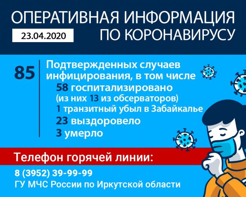 Таким образом общее количество зараженных Covid-19 в Прибайкалье — 85 человек, 58 пациентов сейчас проходят лечение, трое из них госпитализированы из обсерваторов, один зараженный коронавирусом находился в Иркутской области транзитом и уехал в Забайкальский край.