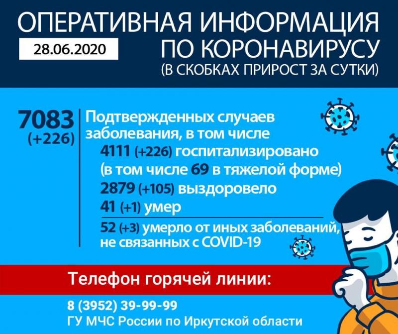 Число подтверждённых случаев заражения коронавирусом в Прибайкалье к утру 28 июня увеличилось на 226 человек. Число погибших возросло до 93.