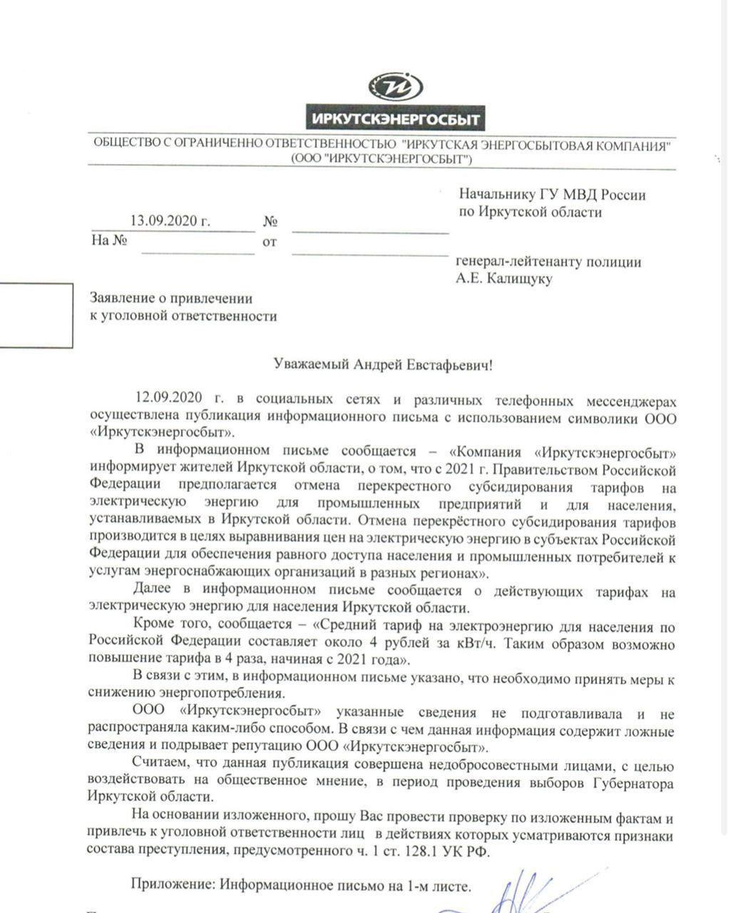 Фотография уведомления на бланке Иркутскэнергосбыта появилась в соцсетях незадолго до выборов губернатора Иркутской области, которые проходят с 11 по 13 сентября. В поддельном документе сообщается, что с 2021 года правительство РФ планирует отменить перекрестное субсидирование тарифов на электроэнергию для промышленных предприятий и населения региона, что приведет к росту цен на электричество в четыре раза.