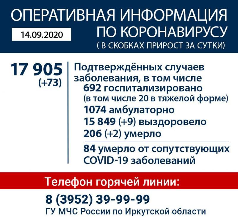По данным на 14 сентября, за сутки в Прибайкалье коронавирус подтвердился ещё у 73 человек. Общее число заболевших — 17905.