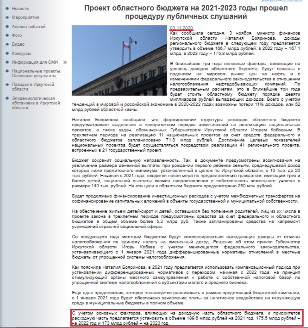 Однако после этого на сайте правительства Иркутской области информация о бюджете в релизе от 3 ноября была скорректирована.