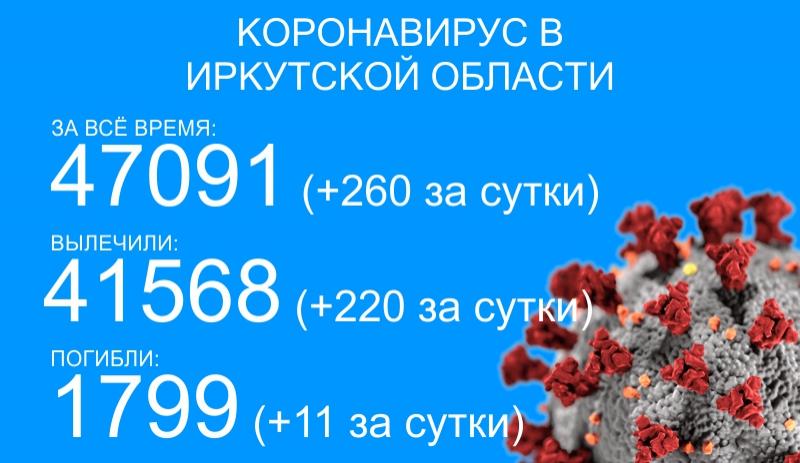 По состоянию на утро 24 января в Иркутской области зарегистрирован 47091 лабораторно подтверждённый случай коронавирусной инфекции. За последние сутки заболевание выявлено у 260 человек. 2408 человек проходят лечение в стационарах.