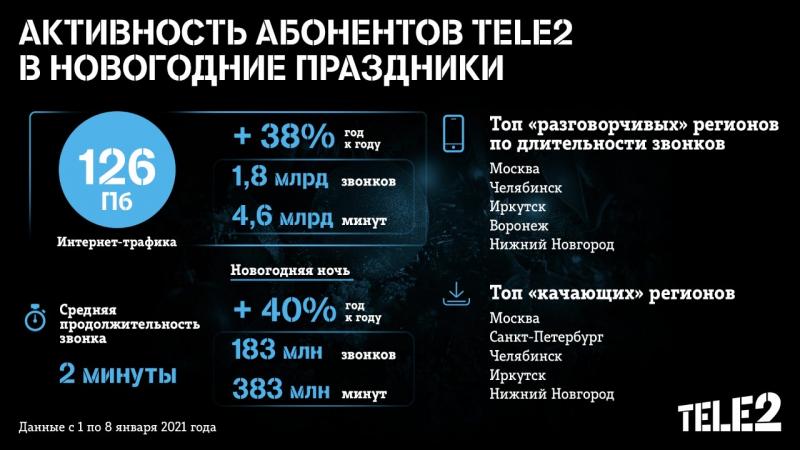 В целом по России в период с 1 по 8 января клиенты компании скачали более 126 Пб интернет-трафика, что на 38% больше год к году. В новогоднюю ночь интернет-трафик абонентов Tele2 вырос на 40% по сравнению с показателем прошлого года. Только с 18 часов 31 декабря 2020 года до 8 утра 1 января 2021 года клиенты оператора скачали 11 Пб данных (против 8 Пб в прошлом году).