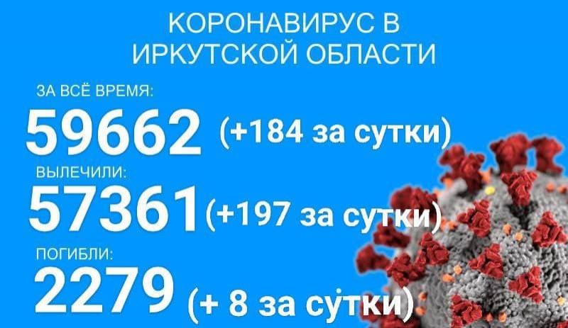В Иркутской области, по данным на 19 марта, зарегистрировано 59662 официально подтверждённых случаев заражения коронавирусом. Прирост за сутки составил 184 новых случая, в том числе один вахтовик и 13 детей до 17 лет, сообщает региональный оперштаб.