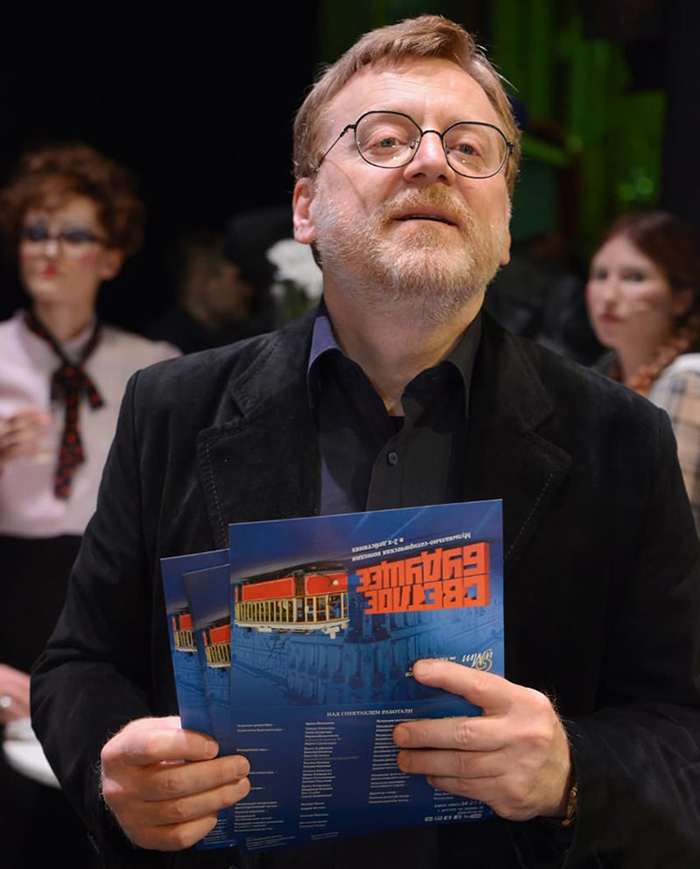 Конечно, хотелось бы более полного «трамвайного» решения, чтобы разворот декорации «сыграл» не только в начале спектакля, но и при смене мест действия, избавив публику от отвлекающих манёвров монтировщиков. Также как не хватило развёрнутой работы проекционного экрана, который, отработав своё в самом начале и задав атмосферу «краснозвёздной Москвы», весь остальной спектакль играл загадочную роль пустого серого задника.