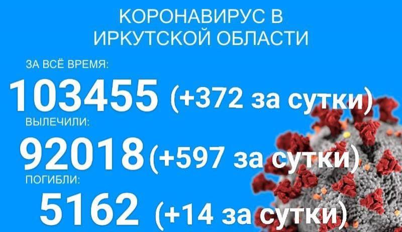 По данным оперштаба Иркутской области на утро 14 сентября, в регионе зарегистрировано 103455 официально подтверждённых тестами ПЦР случая заболевания коронавирусом. За сутки выявлено 372 новых случая, четверо из них - вахтовики и 40 - дети до 17 лет. Всего в области болеет коронавирусом 432 ребёнка.