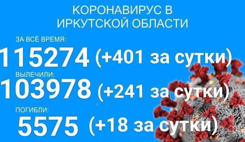 По данным оперштаба Иркутской области, в регионе на утро 15 октября было зарегистрировано 115274 официально подтверждённых тестами ПЦР случая заболевания коронавирусом. За сутки был выявлен 401 новый случай, в том числе 55 детей и двое вахтовиков.