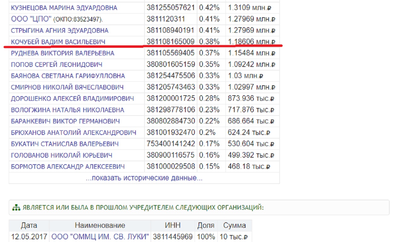 Андрей Васильевич Кочубей имеет в ООО «Академия жизни» долю 0,38% в сумме 1,18 миллиона рублей. Он же работает в министерстве здравоохранения Иркутской области в отделе контрактного управления, то есть по закупкам оборудования. Тут напрашивается первый вопрос, не превышает ли он должностные полномочия? Не оснащена ли клиника св.Луки частично за бюджетные деньги?